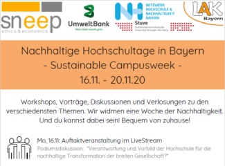 In diesem Jahr werden diese im Rahmen der “Nachhaltigen Hochschultage Bayern” vom 16.11.2020 bis 20.11.2020 stattfinden, die in Kooperation mit der Landes-ASten-Konferenz und dem Netzwerk Hochschule & Nachhaltigkeit Bayern sowie Studierendenvertretungen verschiedener Hochschulen organisiert werden.